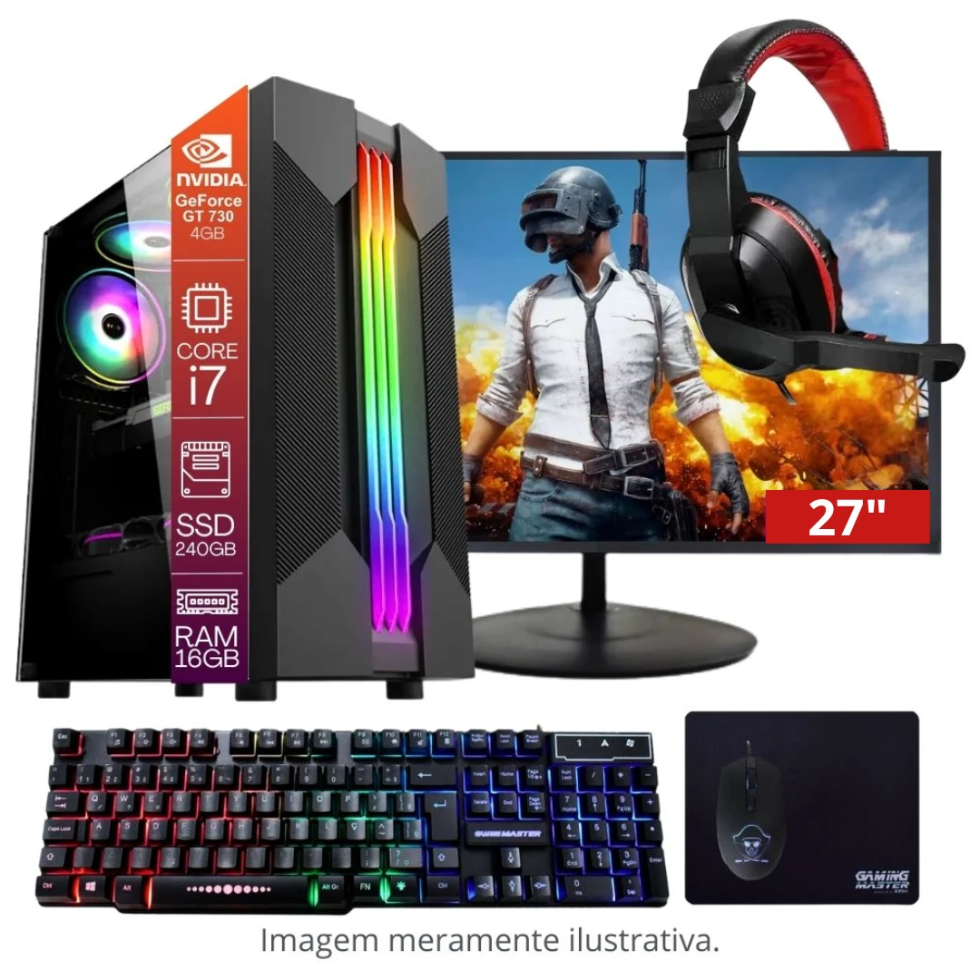 Computador PC Gamer Completo TOB – Intel Core i7, 16GB, SSD 240GB, Geforce 4GB, Monitor 27”, Teclado, Mouse, Mouse Pad e Headset GamerDescrição O Computador PC Gamer Completo TOB foi desenvolvido para oferecer alto desempenho, design moderno e experiência imersiva tanto em jogos quanto em atividades do dia a dia. Equipado com processador Intel Core i7, 16GB de memória DDR3 e SSD de 240GB, o sistema proporciona velocidade, estabilidade e capacidade de resposta superior, garantindo inicializações rápidas e execução fluida de softwares e games modernos.O kit acompanha gabinete gamer com iluminação RGB, teclado e mouse RGB, mouse pad gamer, headset de alta qualidade, e um monitor de 27 polegadas com conexões HDMI e VGA, proporcionando uma experiência visual ampla e envolvente. Ideal para jogadores, criadores de conteúdo e usuários que buscam desempenho, praticidade e estética em um único conjunto.Especificações TécnicasProcessador: Intel Core i7 3.4GHz Memória RAM: 16GB DDR3 Armazenamento: SSD 240GB Placa de Vídeo: Geforce GT 730 4GB Fonte de Alimentação: ATX compatível Sistema Operacional: Windows 10 Pro (versão de avaliação)Placa-Mãe Chipset: Intel H61 Socket: 1155 Suporte: Intel Core i3, i5, i7 Slots de memória: 2x DDR3 (expansível até 16GB) Arquitetura de memória: Dual Channel DDR3 Conectividade e Entradas 1x Saída VGA 1x Saída HDMI 6x Portas USB 2.0 1x Porta RJ-45 (Rede LAN 10/100 Mbps) Entradas de áudio HD: linha, alto-falante e microfone Características e Recursos Gabinete gamer RGB com design moderno e ventilação eficiente Teclado e mouse gamer RGB, com resposta rápida e iluminação ajustável Mouse pad gamer para precisão de movimentos Headset gamer com som imersivo e microfone integrado Monitor de 27 polegadas com resolução nítida e excelente taxa de atualização Desempenho otimizado para jogos, edição de vídeo, streaming e multitarefas Sistema pronto para uso, com Windows 10 Pro configurado e diversos jogos pré-instalados Conteúdo da Embalagem 01 Computador Gamer TOB RGB conforme especificações 01 Monitor 27” HDMI + VGA 01 Teclado Gamer RGB 01 Mouse Gamer RGB 01 Mouse Pad Gamer 01 Headset Gamer 01 Cabo de força 01 Manual do usuário